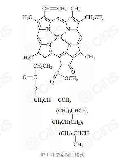 葉綠素銅(COPPERCHLOROPHYLL)也是一種著色劑,其結構式如圖1所示。葉綠酸-銅絡合物和葉綠素銅不是同一種物質(zhì),葉綠素銅未收載于《化妝品安全技術規(guī)范》著色劑列表中,其作為著色劑使用的安全性需要進一步論證。