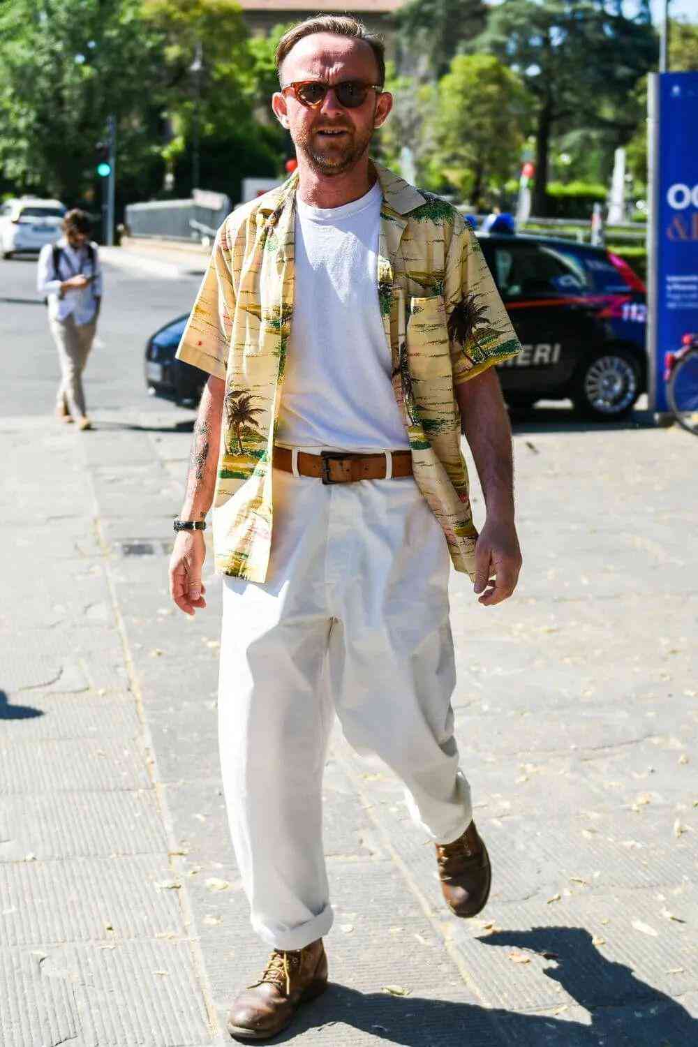 印花短袖襯衣內搭白色T恤,打造“內簡外繁”的疊穿造型,下面選擇一條白色休閑褲,縱向延伸視覺更顯高。