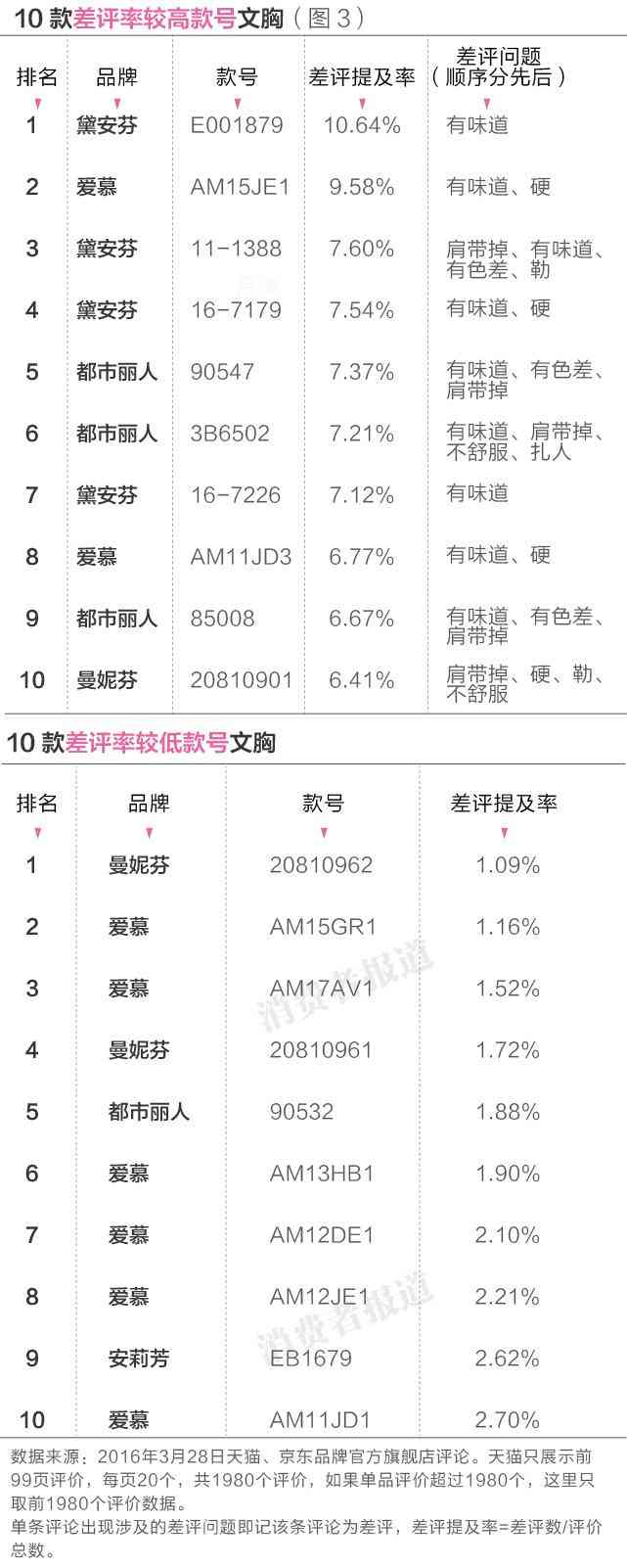 除了整體品牌之外,具體型號的槽點也不盡相同。本刊列出了此次對比的84款文胸中差評占比較高的和較低的十款文胸,供消費者具體參考。(如圖3)