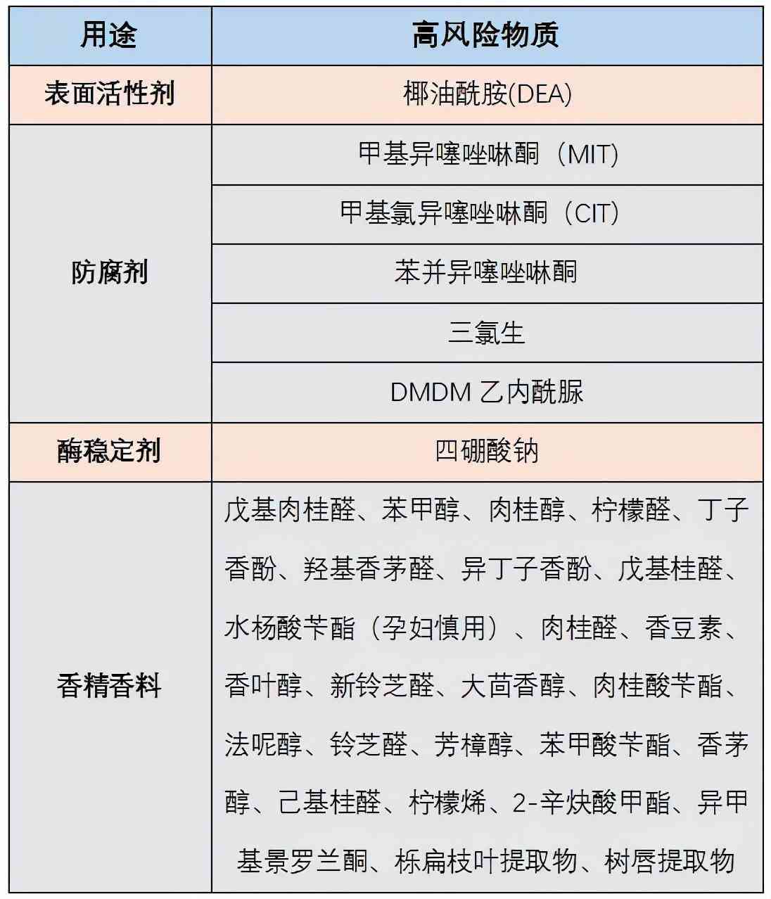 比較安全的表面活性劑成分有:烷基糖苷(APG)、椰油酰胺丙基甜菜堿(CAB-35)和脂肪醇聚氧乙烯醚硫酸鈉(AES),對(duì)人體皮膚刺激性弱、低毒性、且相對(duì)環(huán)保。需要留意的表活成分有椰油酰胺(DEA),可能引起過敏;以及四硼酸鈉,國家規(guī)定不得使用于 3 歲以內(nèi)的嬰兒洗滌用品。需要留意的高風(fēng)險(xiǎn)成分包括:熒光增白劑、香精、增稠劑、色素和部分防腐劑(例如:異噻唑啉酮),致敏風(fēng)險(xiǎn)較高。