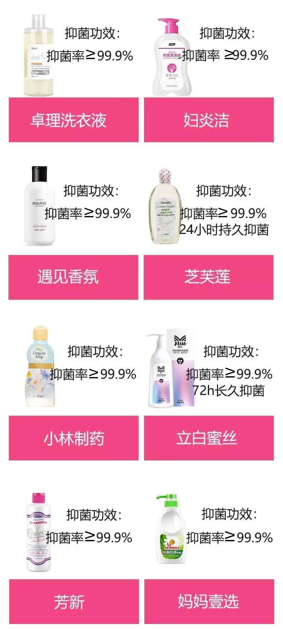 卓理、立白蜜絲>遇見香芬、婦炎潔>芝芙蓮、小林制藥、芳新、媽媽壹選(“>”號(hào)代表“優(yōu)于”,從前往后效果逐漸變差)