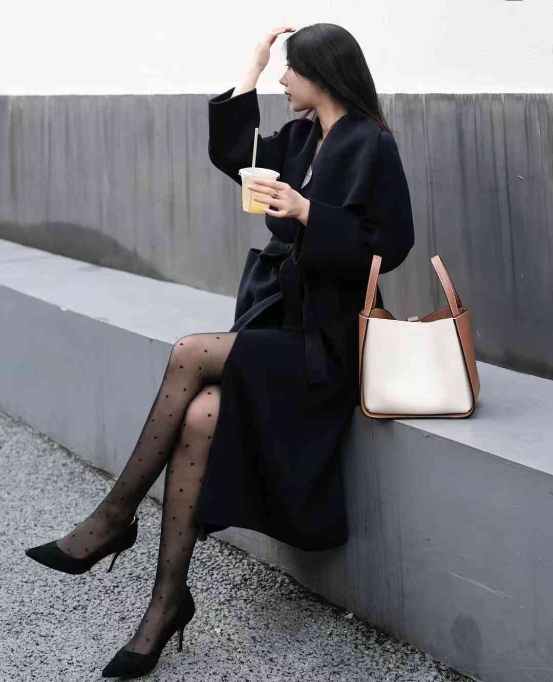look1 藏青色大衣+波點(diǎn)絲襪/黑色高跟鞋