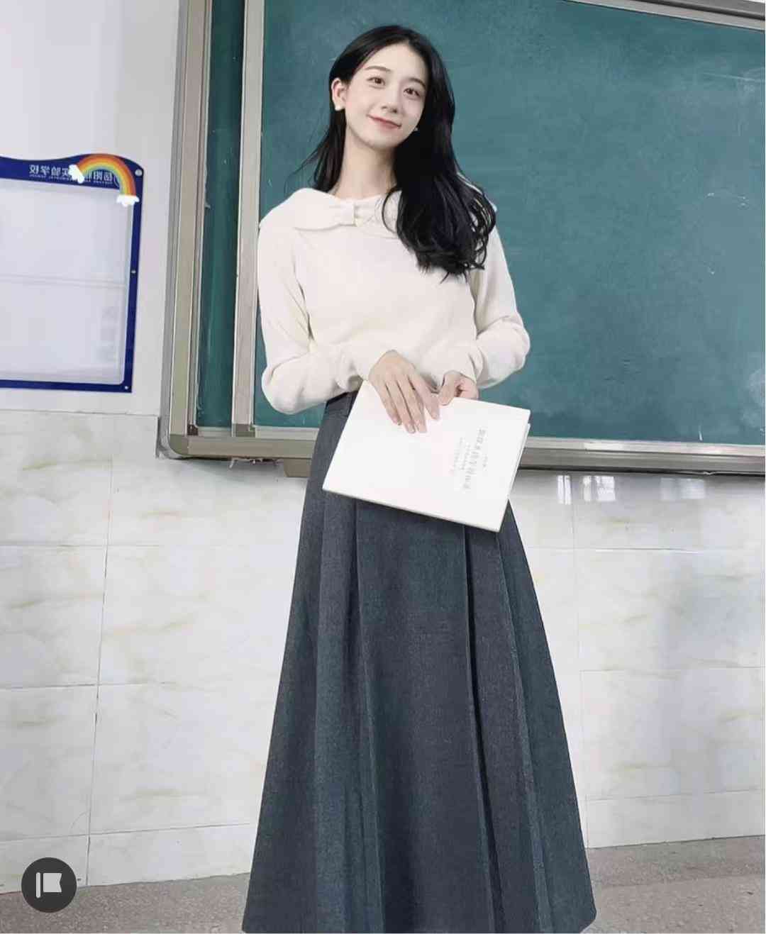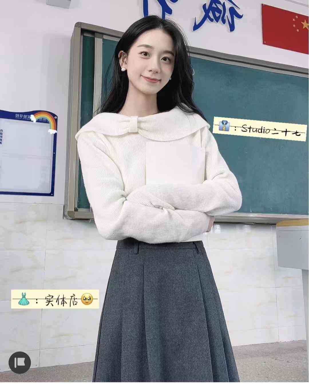 白毛衣真的自帶打光版和濾鏡,超顯白很襯人了!一字領(lǐng)非常顯氣質(zhì),誰(shuí)穿誰(shuí)是冬季韓劇女主,而且設(shè)計(jì)很巧妙,完全不露!搭灰色百褶裙比較知性溫柔,配牛仔褲肯定也好看的~