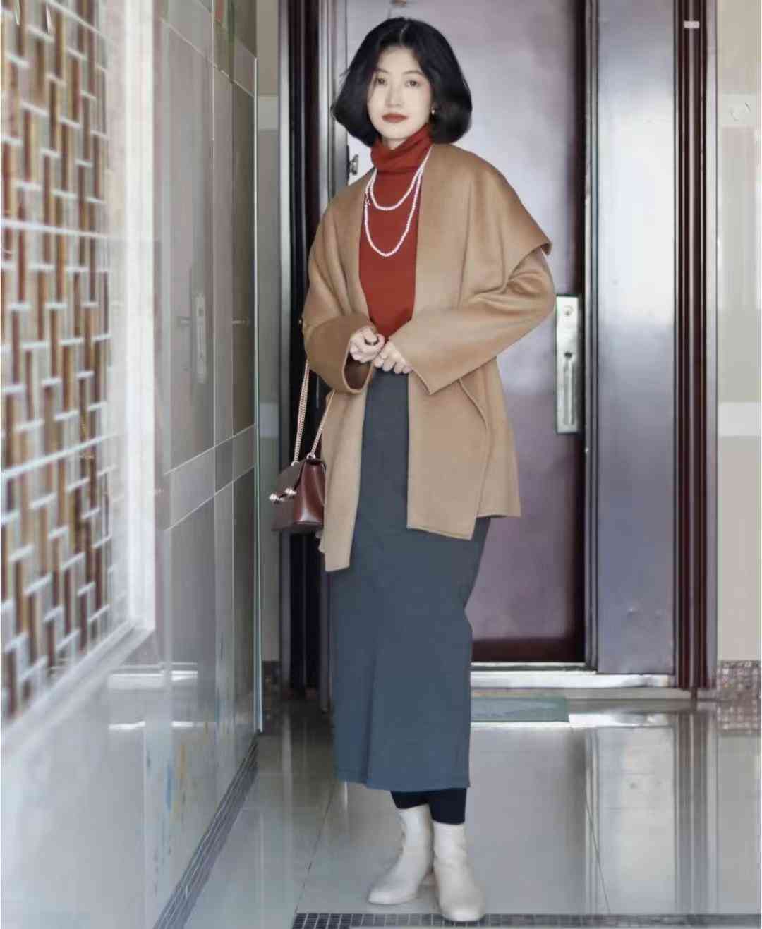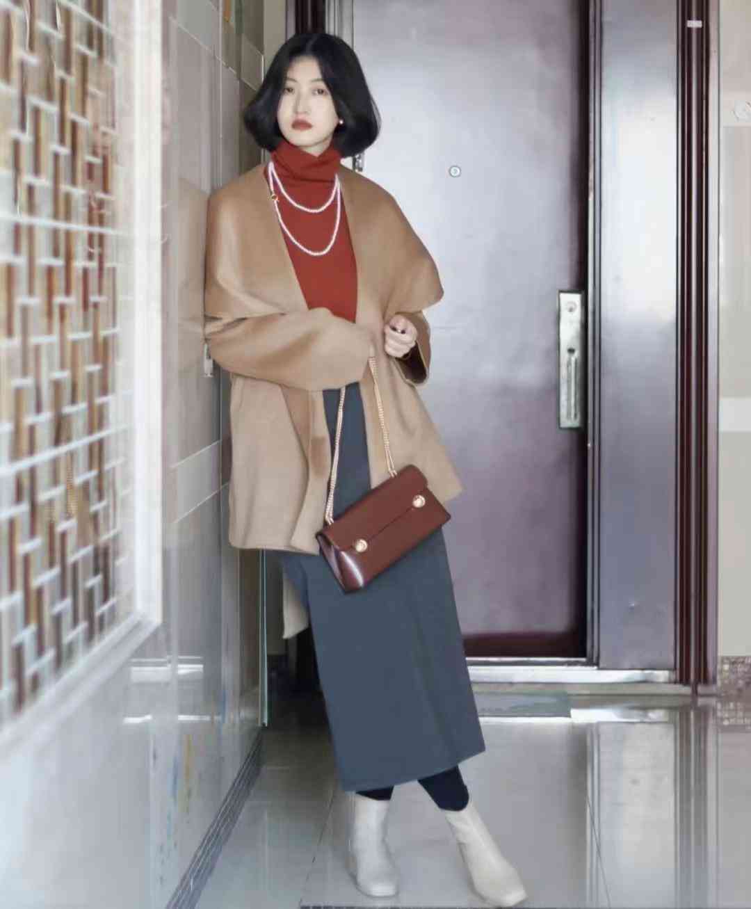 這身的look是純色配搭,上裝是簡(jiǎn)約的駝色大衣+高領(lǐng)打底衫,下裝是灰色基本款半裙,一套對(duì)梨型身材太友好~
