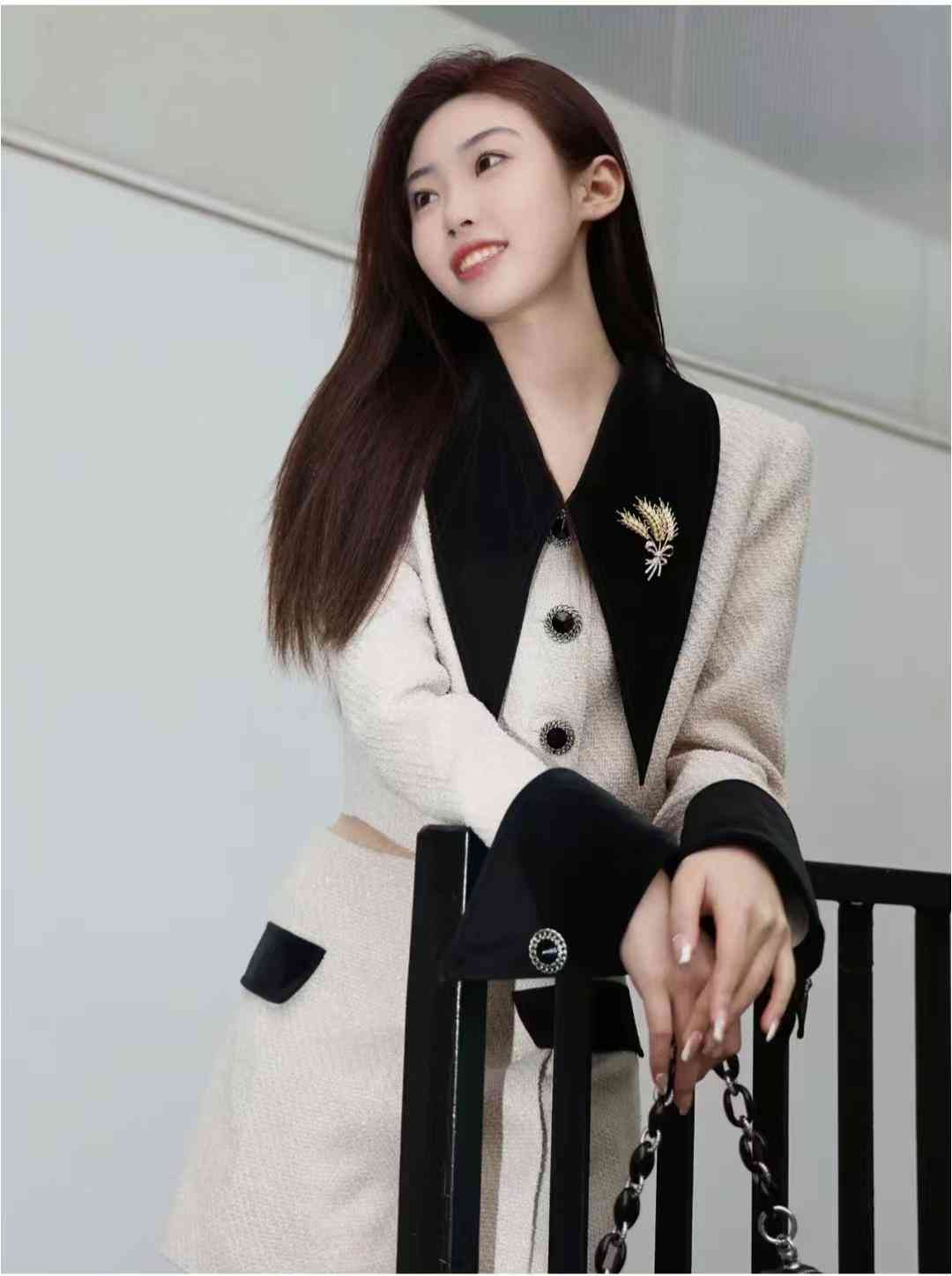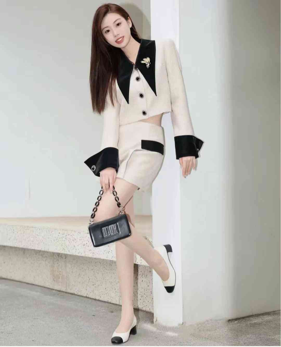 摩登格調(diào)的小香風(fēng)套裝,T型廓形的設(shè)計(jì),穿搭立刻氣場(chǎng)拉滿,領(lǐng)口假兩件設(shè)計(jì)平添層次,還帶來(lái)一絲法式文藝氣息;鞋子也是選擇了鑲鉆裝飾,為整體穿搭點(diǎn)綴精致的高級(jí)感~