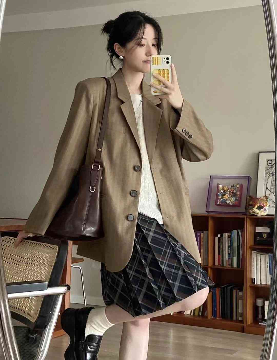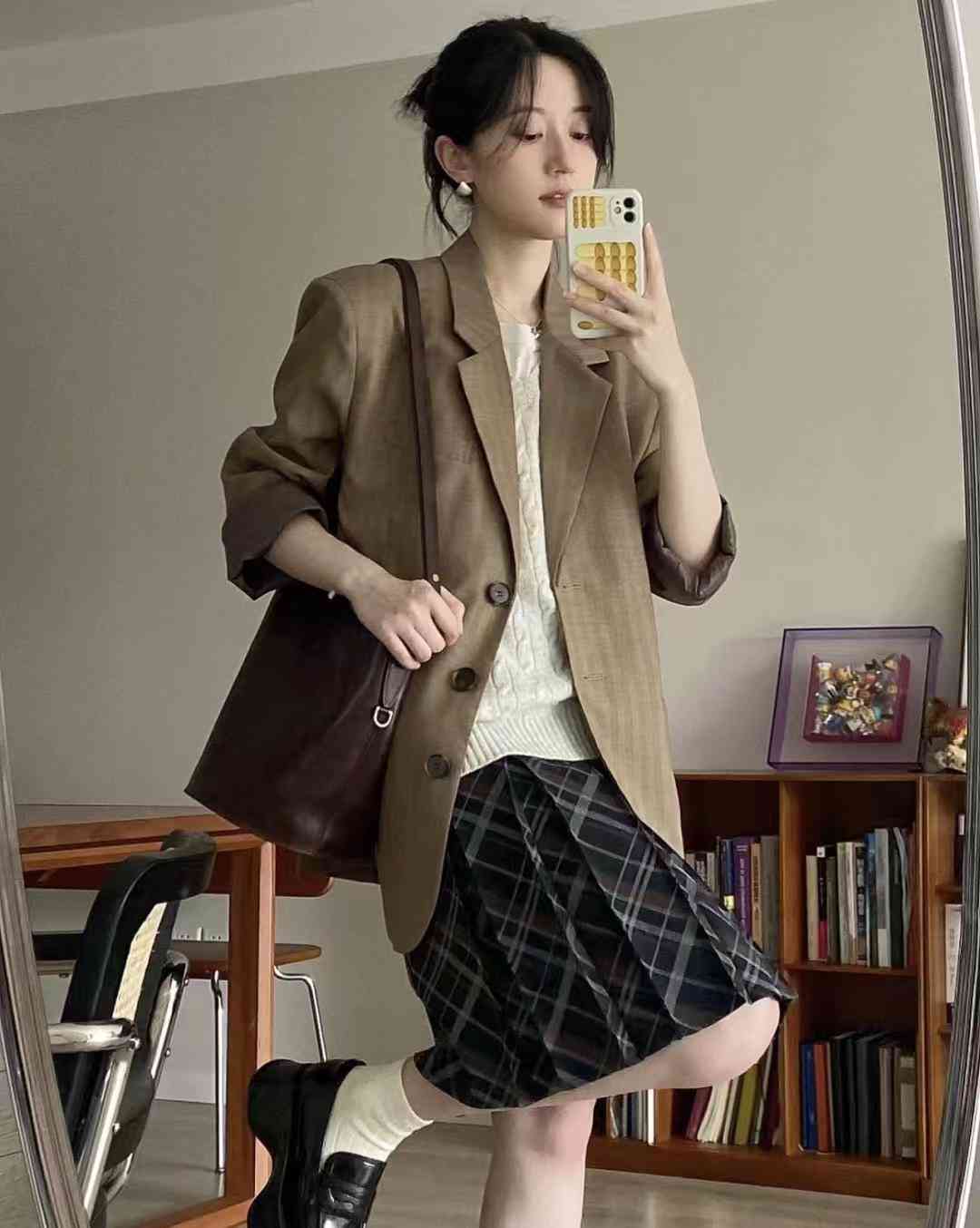 這個(gè)季節(jié)少不了一件百搭的棕色西裝,還帶一點(diǎn)點(diǎn)墊肩,是窄肩星人的最愛了,疊穿麻花背心,再配上格紋裙復(fù)古學(xué)院氛圍感直接拉滿~
