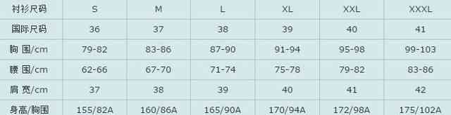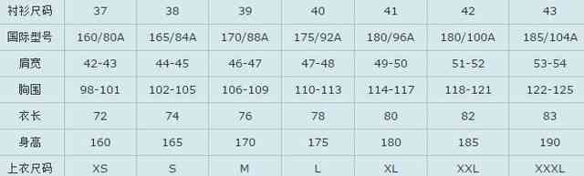女襯衫標準尺碼對照表