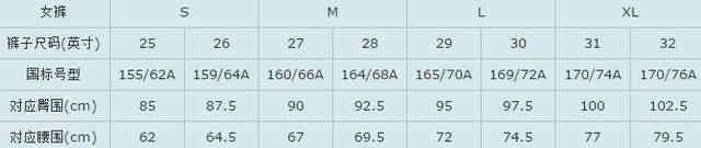 女褲尺碼對照表