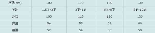 說明:上述提供的計算公式是根據(jù)經(jīng)驗得到的數(shù)據(jù)參數(shù),試用于絕大多數(shù)人群,不適用于特殊體型要求。注意:表格中尺碼項即為小孩身高,請顧客按照尺碼項選擇合適的碼數(shù),寶貝幼嫩肌膚。