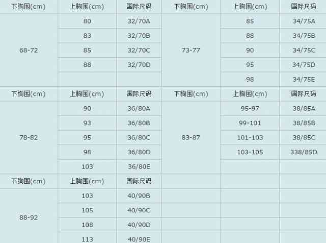 文胸尺碼對照表