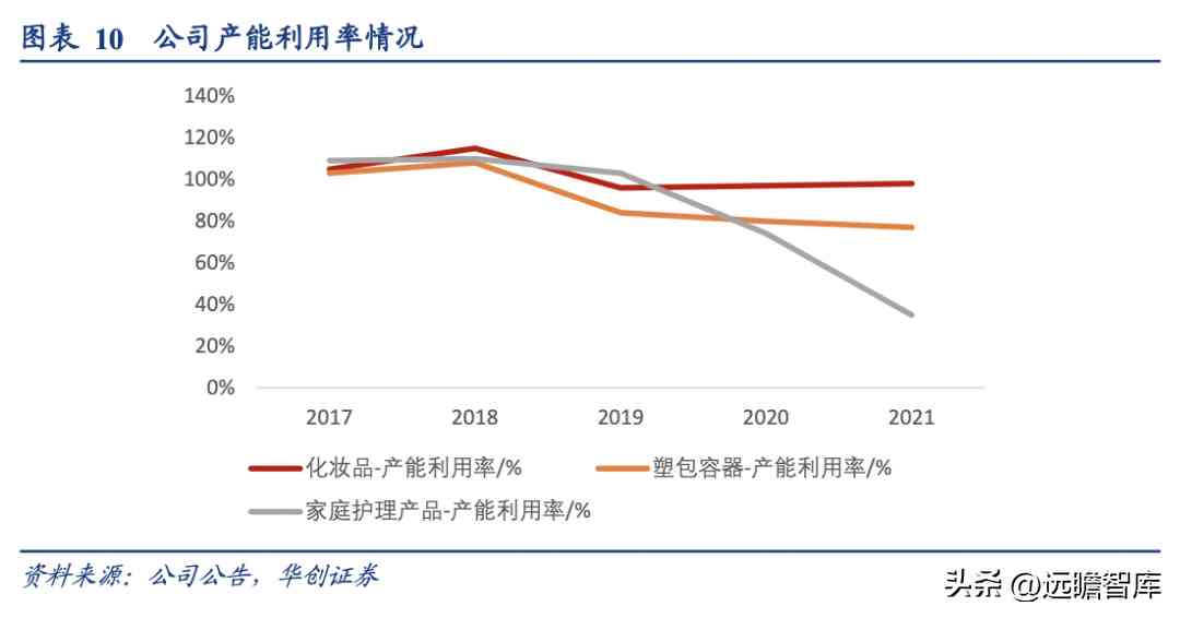 公司化妝品業(yè)務(wù)較快發(fā)展,2021年塑包業(yè)務(wù)收入已經(jīng)下降至35.30%,化妝品業(yè)務(wù)占比超過一半,剩余家庭護(hù)理產(chǎn)品業(yè)務(wù)占比8%+。