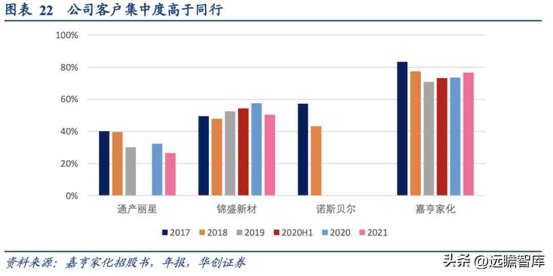 公司主要客戶為強生、上海家化、郁美凈、貝泰妮、百雀羚、殼牌、益海嘉里等國內(nèi)外知名品牌(部分為集團(tuán)企業(yè),旗下不同子公司向公司采購內(nèi)容不同),前五名客戶收入占比約7-8成,顯著高于同行業(yè)可比上市公司的在3-6成。