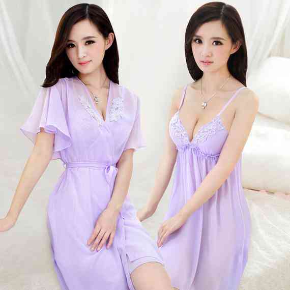 4、性感睡衣女誘惑夏季透明睡袍帶胸墊吊帶睡裙兩件套裝蕾絲家居服