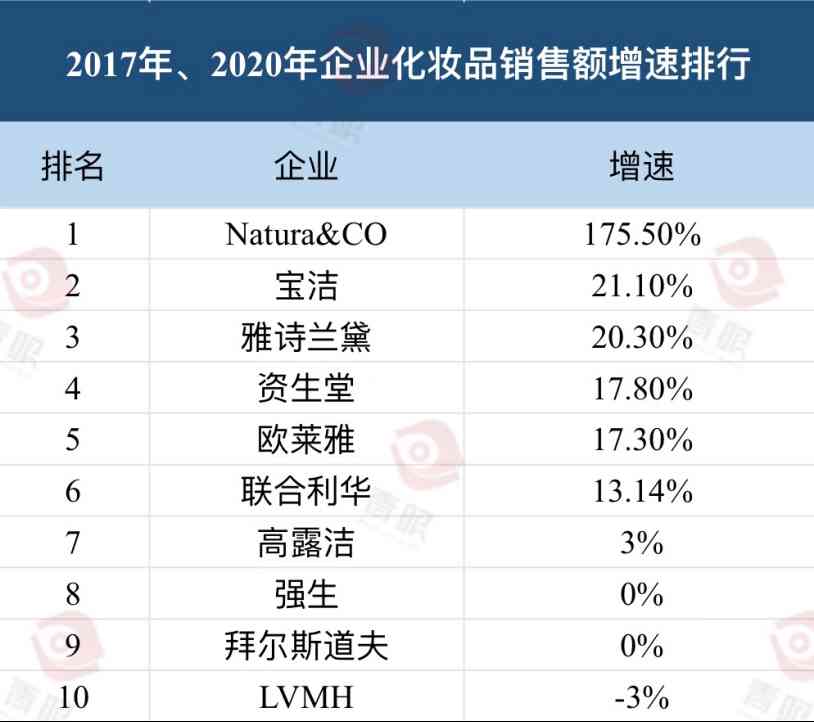 從銷售額增速來看,相比2017年,2020年全球十大化妝品企業(yè)銷售額獲得了普遍上漲,僅LVMH一家企業(yè)化妝品銷售規(guī)模小于2017年。其中Natura&CO增速最快,達(dá)175.5%。寶潔、雅詩(shī)蘭黛、資生堂、歐萊雅、聯(lián)合利華五大企業(yè)增速均保持在兩位數(shù)水平。