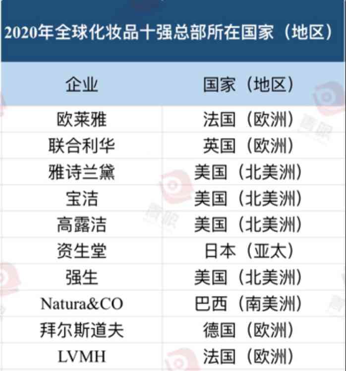 從地域來看,歐洲與北美洲分庭抗禮,均有四家企業(yè)入榜單;從國(guó)家來看,美國(guó)仍是頭部化妝品企業(yè)的主陣地,雅詩(shī)蘭黛、寶潔、高露潔、強(qiáng)生總部均位于此;資生堂集團(tuán)則是亞太地區(qū)的“獨(dú)苗”。