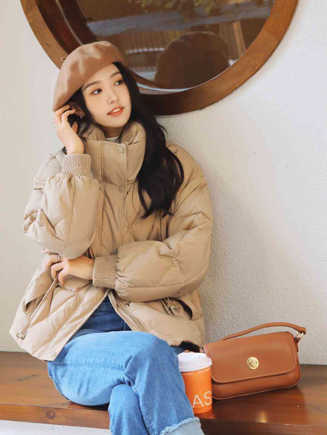 .套就非常適合我們每天上班的姑娘了,一件短款羽絨服上衣,搭配上一條經(jīng)典牛仔褲,加上一雙棕色的短靴漂亮大氣,包包和貝雷帽的顏色也是棕色,整個造型形成了首尾呼應(yīng)的效果,協(xié)調(diào)自然又漂亮大氣。