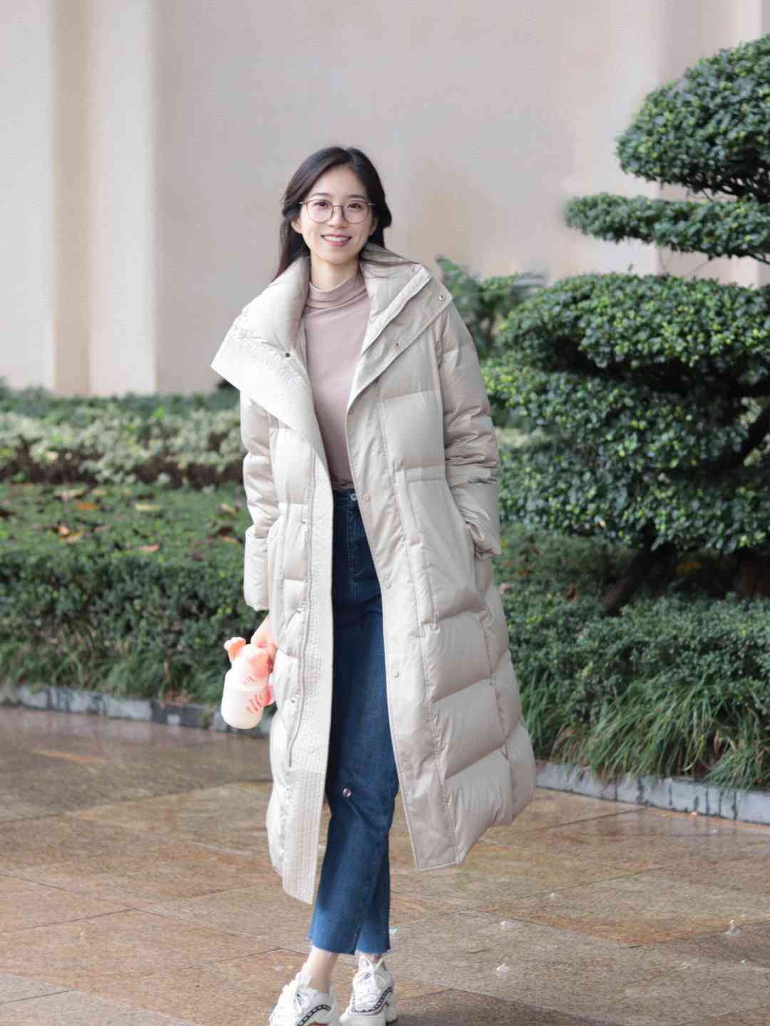 如果你是在北方城市生活,早晚上下班的時候冷風(fēng)容易從衣角吹進(jìn)來,那么咱們可以換成長款的羽絨服來搭配,像下面這套穿搭就很不錯,煙灰色系列的羽絨服外套,內(nèi)搭香芋色的打底衫,把打底衫扎進(jìn)牛仔褲里面提升腰線,顯高又顯瘦。