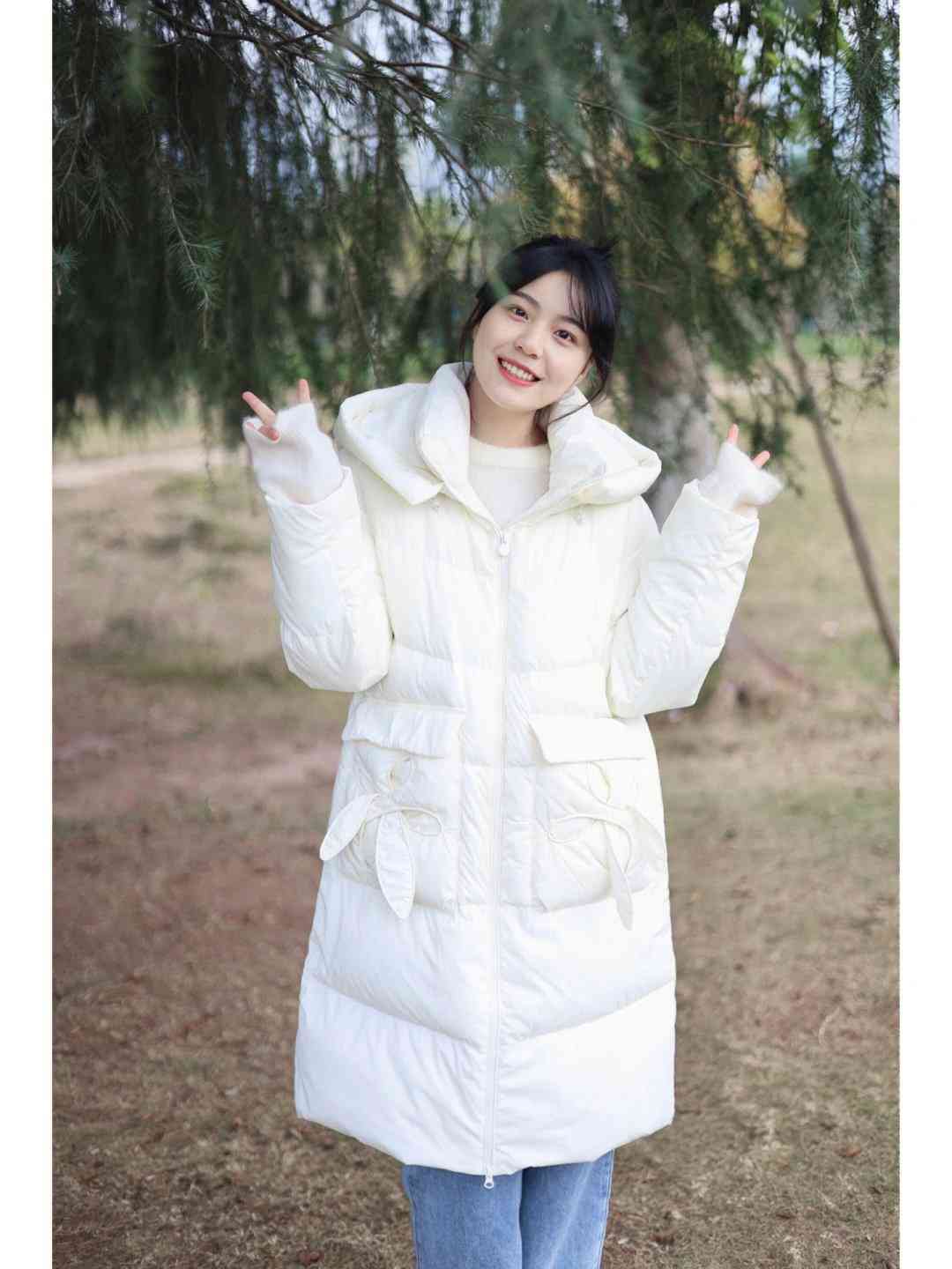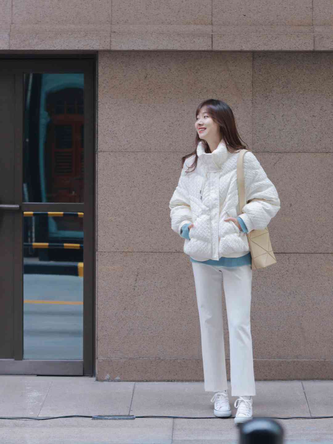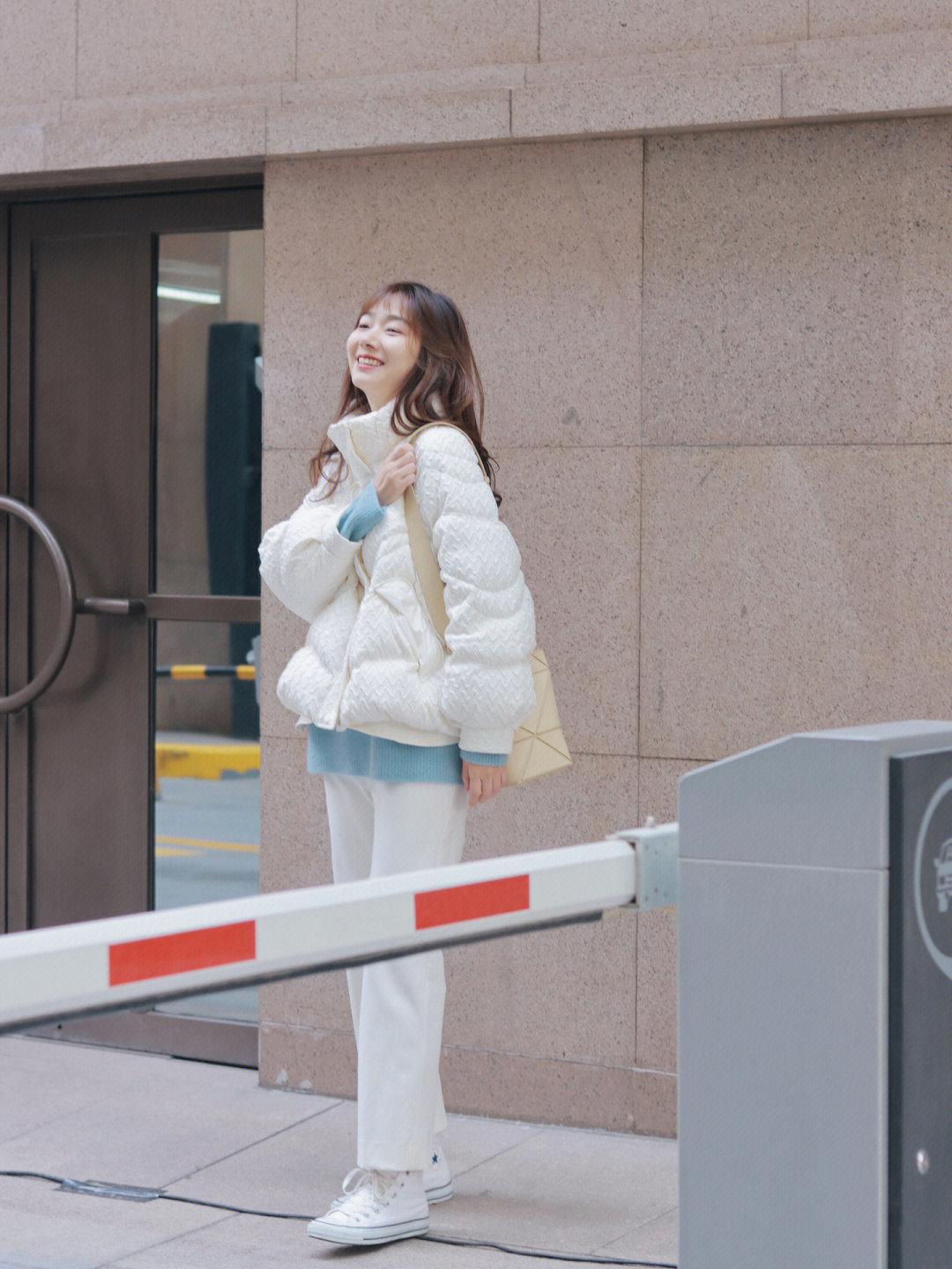 上面只一套比較適合奔三奔四的女性借鑒穿搭,如果你是20歲出頭的小姑娘,我們可以選擇亮一些的顏色,白色雖然是基礎(chǔ)色,但是很亮眼也很修飾人,白色羽絨服百搭耐看,下面這位博主內(nèi)搭用了淺藍(lán)色的針織衫做打底,露出袖子和衣角,顯得更加有層次感,下裝加上九分牛仔褲和休閑鞋,帶著微微的笑容,甜美俏皮又可愛。