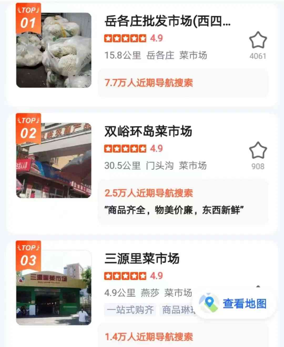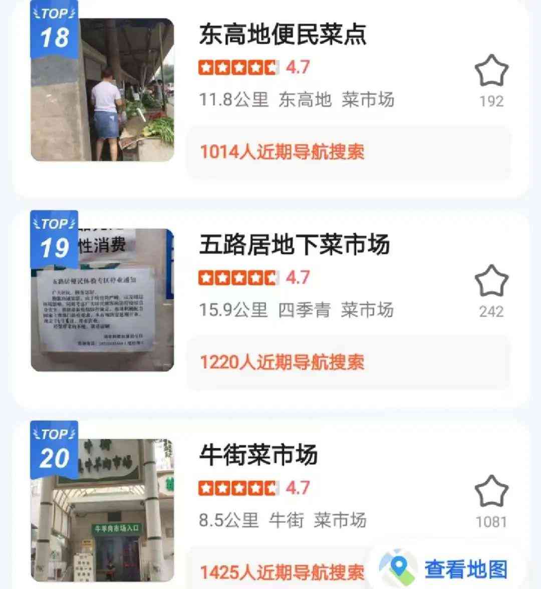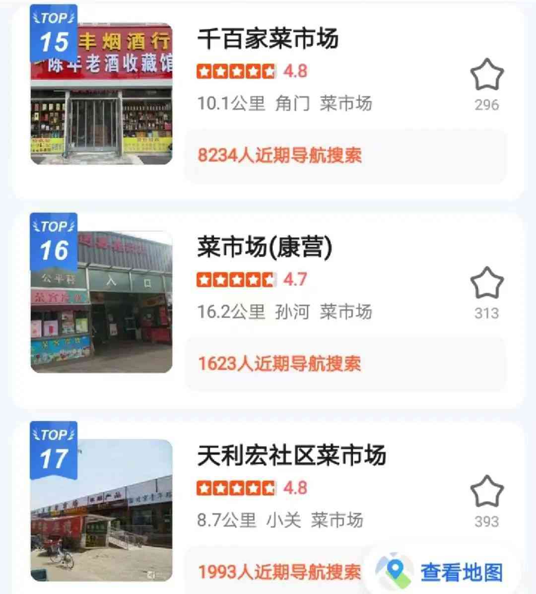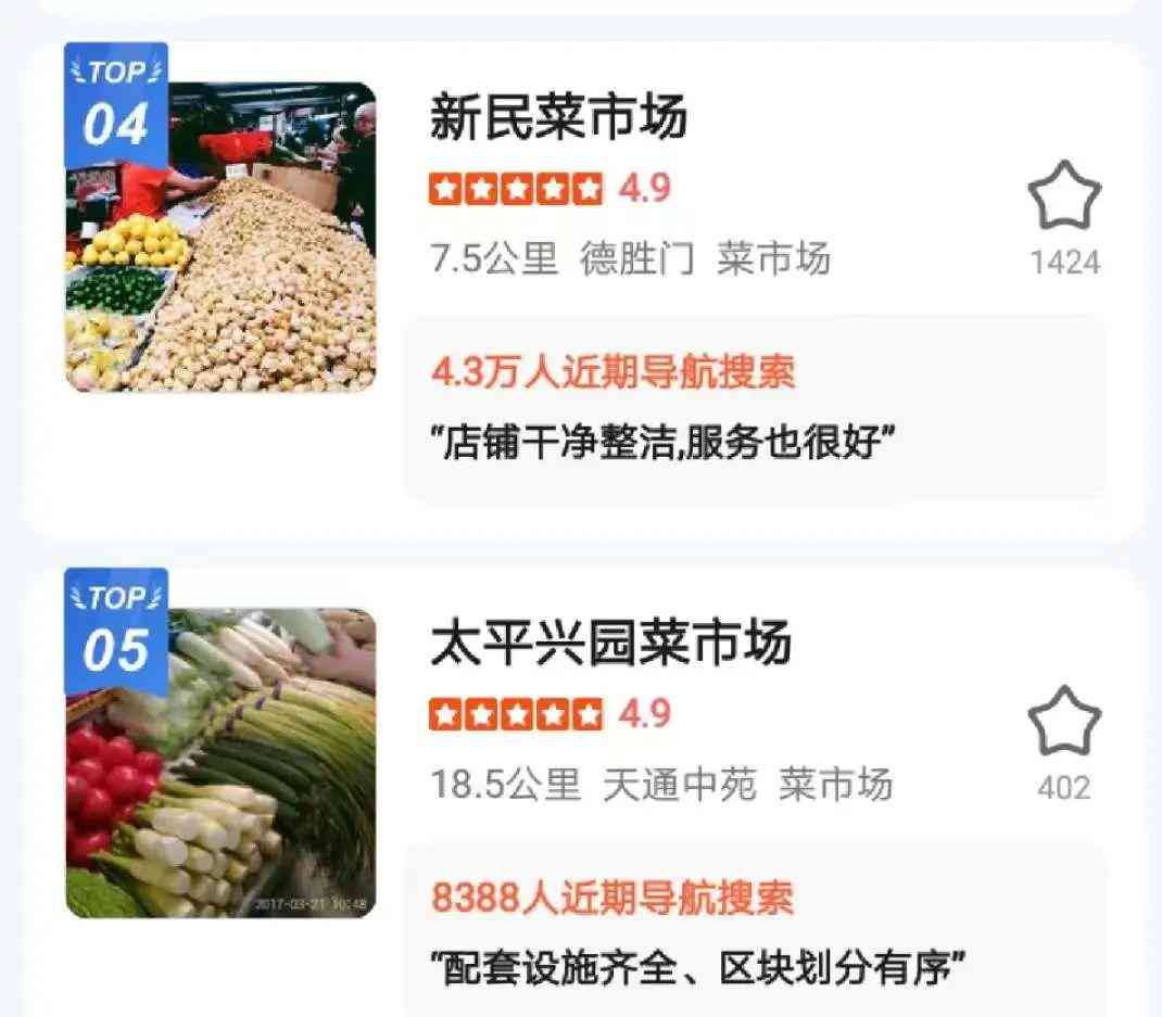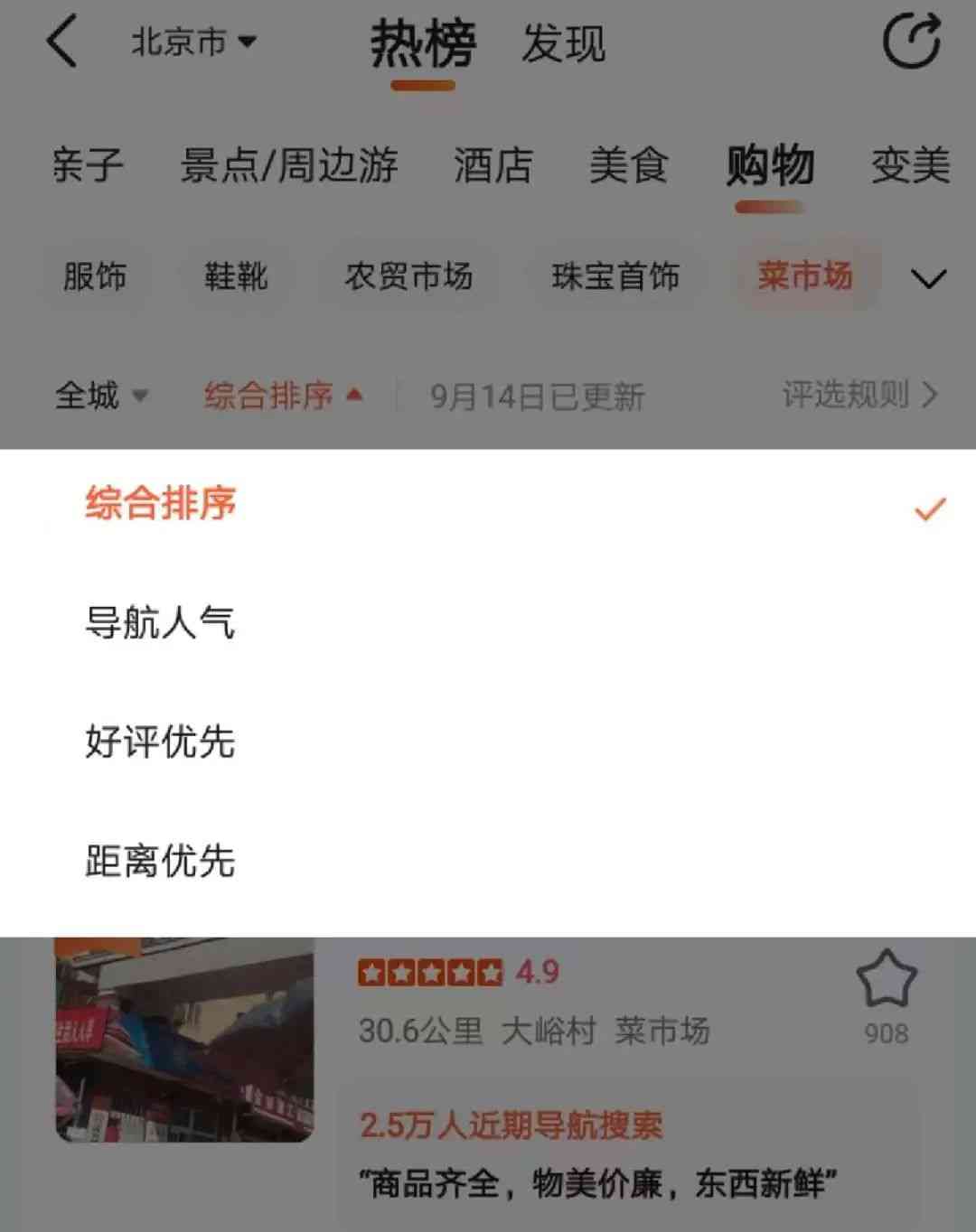 以上菜市場排名為“綜合排序”名次。除此之外,還可按照“導(dǎo)航人氣”、“好評優(yōu)先”、“距離優(yōu)先”排名,選擇的標(biāo)簽不同,排名也會發(fā)生變化。