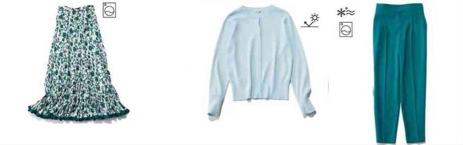 比如,藍綠色半身裙,淺藍色開衫,藍綠色九分褲。