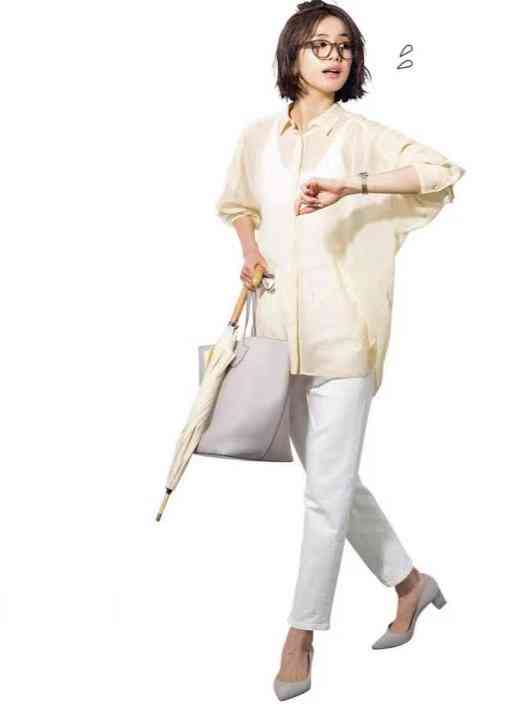 米黃色透視襯衫,因?qū)捤砂嫘投燥@休閑,原本可以寫盡優(yōu)雅與性感的。搭配白色背心與小白褲,比較普通,不太適合講究女人。