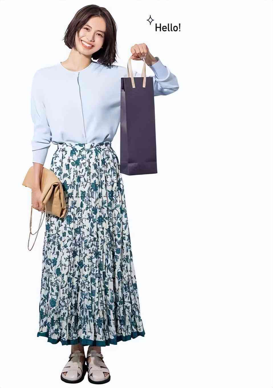 白色綠花,無規(guī)則雜亂鋪陳,更與甜美相呼應(yīng)。搭配淺藍針織衫,集凝練可愛于一體,好愜意!