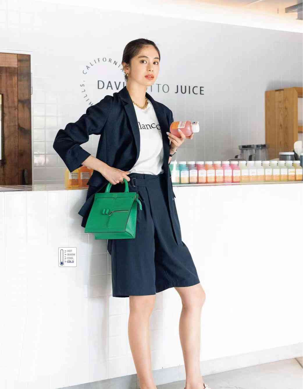 搭配黑色西裝,內(nèi)里白T恤銜接,竟和諧得無可挑剔。當(dāng)然,綠色包包點綴,拯救了整體焦點。