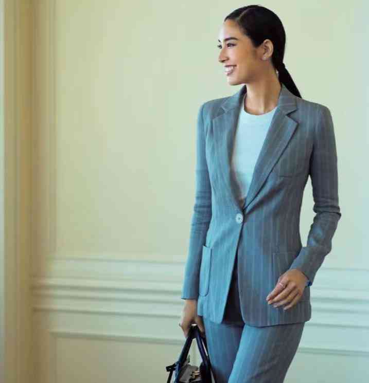 休閑西裝的要求相對(duì)隨意很多,針對(duì)女士,它還要與頭面部、肩膀有修飾效果。合適之上,還要加入美感成分。