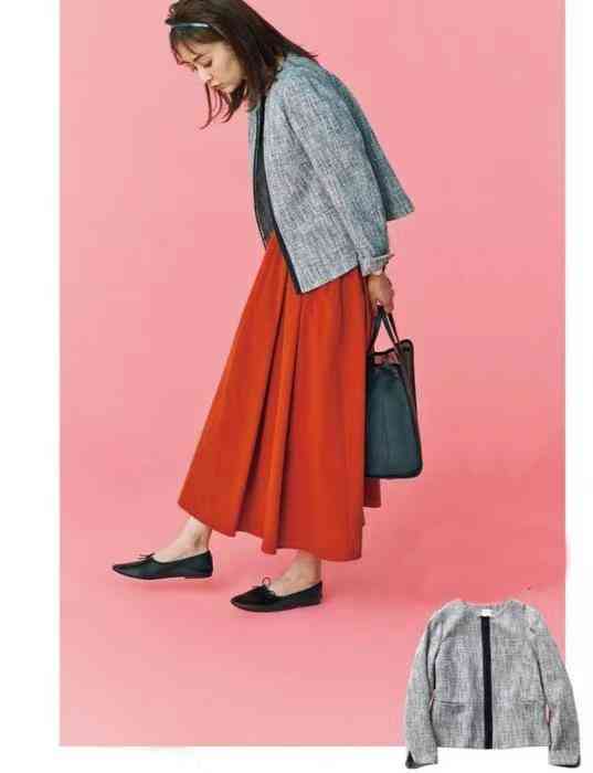 灰色短外套,與橙紅色半裙的浪漫邂逅,大氣不失驚艷。根據(jù)身高,平底鞋、休閑鞋、高跟鞋皆可為之增輝。