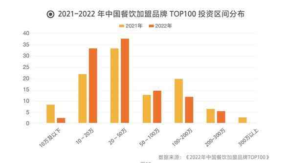 2021-2022年中國(guó)餐飲加盟品牌TOP100投資區(qū)間分布