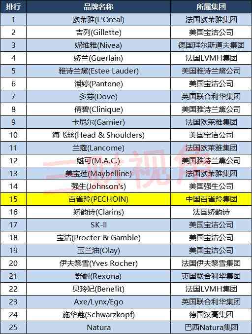 從所屬企業(yè)來看,有9個品牌來自美國保潔公司,7個品牌來自英國聯(lián)合利華集團,6個品牌來自法國歐萊雅集團,4個品牌來自美國雅詩蘭黛公司,3個品牌來自法國LVMH集團,3個品牌來自巴西Natura集團,不難發(fā)現(xiàn)化妝品和個人護理品牌的集中度非常之高,歐美幾個發(fā)達(dá)國家已經(jīng)形成了頭部壟斷,而且強強聯(lián)合的趨勢非常明顯。
