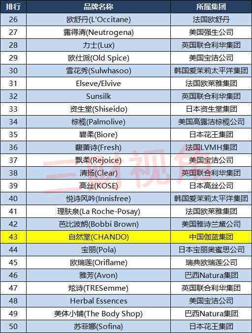 施華蔻排名第24,Natura排名第25;歐舒丹排名第26,露得清排名第27;