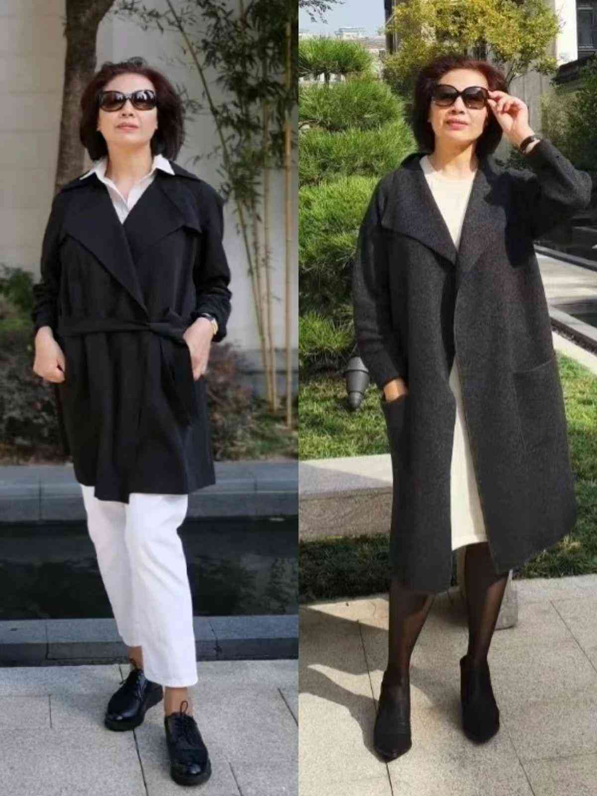 又或者上面這款黑色大衣,經(jīng)典大方,對膚色也很友好,穿在身上輕松體現(xiàn)中年媽媽們的穿衣品味。