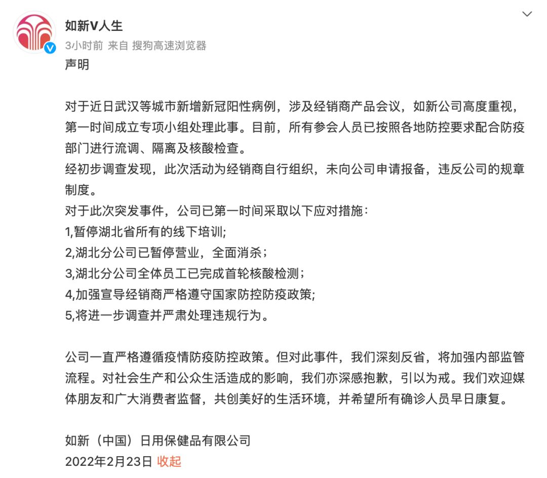 培訓會致19例陽性如新回應(yīng):為經(jīng)銷商自行組織,未向公司申請報備2月21日晚間至2月22日上午,武漢、北京、青島各新累計新增的19例陽性均指向某公司在武漢舉辦的一場培訓班。根據(jù)“武漢市3例新冠病毒核酸檢測陽性人員處置情況的報告”中的流調(diào)記錄顯示,疫情防控通報中所稱的“某公司培訓班”正是如新化妝品公司組織的員工培訓。對此,今日如新官微公開回應(yīng)稱,此次活動為經(jīng)銷商自行組織,未向公司申請報備,違反公司的規(guī)章制度。對于此次突發(fā)事件,公司已.時間采取應(yīng)對措施,暫停湖北省所有的線下培訓,將進一步調(diào)查并嚴肅處理違規(guī)行為。