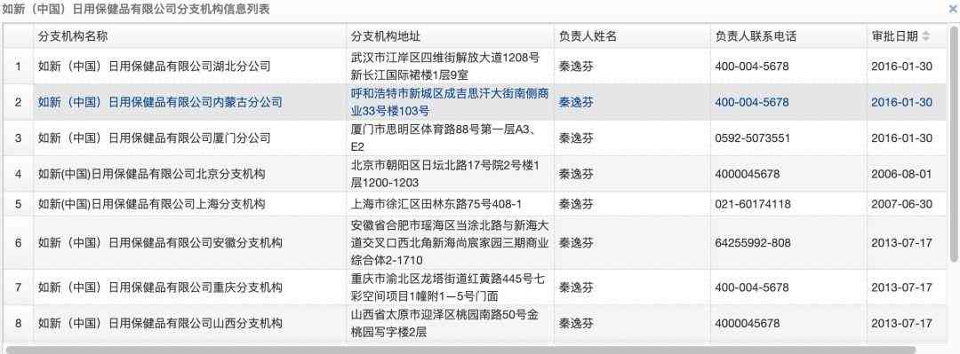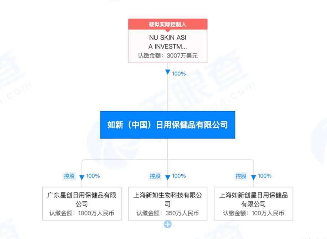 據(jù)天眼查app顯示,如新(中國)日用保健品有限公司成立于1993年3月28日,是一家外國法人獨資的有限責任公司,注冊資本3007萬美元。旗下?lián)碛袕V東星創(chuàng)日用保健品有限公司、上海新如生物科技有限公司、上海如新創(chuàng)星日用保健品有限公司三家公司。