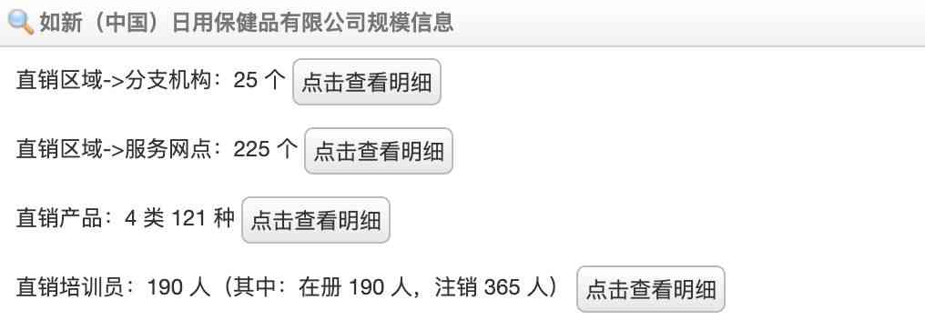 記者查詢商務(wù)部直銷行業(yè)管理網(wǎng)站發(fā)現(xiàn),如新在中國有包括武漢、呼和浩特、上海、廈門、合肥、重慶、太原、蘭州等在內(nèi)的25個直銷分支機構(gòu),此外還有225個服務(wù)網(wǎng)點、4類121種直銷產(chǎn)品、190個直銷培訓員。