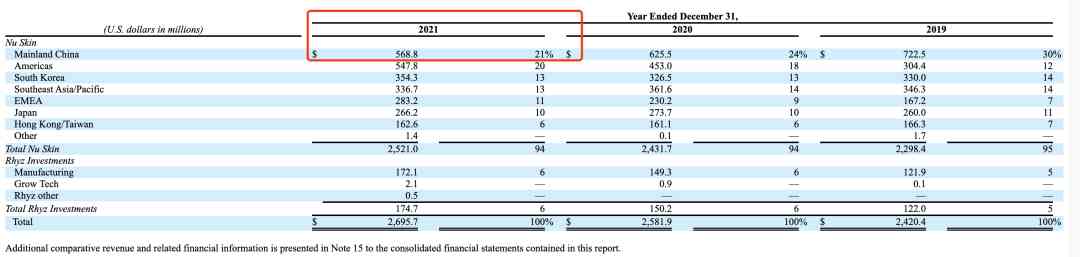 雖然業(yè)務(wù)遍布全世界50個多個國家地區(qū),但中國區(qū)仍是其最大市場。數(shù)據(jù)顯示,如新2021年中國大陸業(yè)績約為5.69億美元,占據(jù)全球市場份額的21%,比例有所下滑。