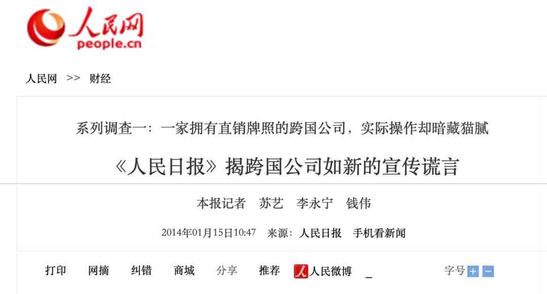 在《揭跨國公司如新的宣傳謊言》一文中,人民日報報道稱,記者參加了如新公司在北京市郊某酒店舉辦的“2014 NU SKIN星峰大會”。