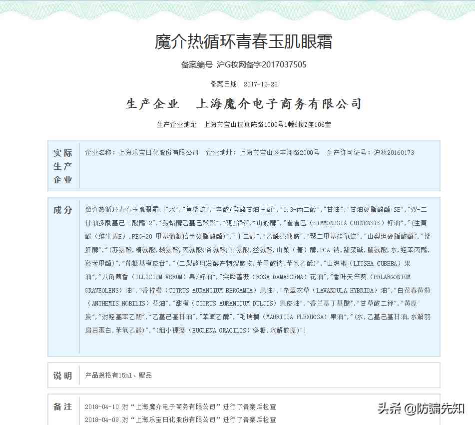 中新融媒在國產(chǎn)非特殊用途化妝品備案服務(wù)平臺查詢到“魔介熱循環(huán)青春玉肌眼霜”,該產(chǎn)品實際生產(chǎn)企業(yè)是上海樂寶日化股份有限公司。此外,同樣借用“細胞自噬”原理的產(chǎn)品遠不止一款產(chǎn)品,還包含魔介熱循環(huán)雪肌精華液、魔介熱循環(huán)小V臉精華霜、魔介熱循環(huán)小分子玻尿酸補水面膜、魔介熱循環(huán)鮮活VC雪肌面膜,以上產(chǎn)品具有不同的美白等功效,但是在國家藥品監(jiān)督管理局國產(chǎn)特殊用途化妝品中卻沒有任何功效備案信息。