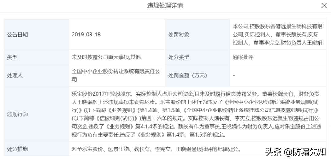 據(jù)悉,2019年3月18日,一則《關(guān)于公司收到關(guān)于給予上海樂寶日化股份有限公司、香港遠景生物科技有限公司、魏長有、李憲立、王曉娟通報批評的紀律處分的決定的公告》顯示,2017 年度,樂寶股份實際控制人魏長有以借款名義違規(guī)占用樂寶股份資金 390萬元,其實際控制的樂寶股份控股股東遠景生物以借款名義違規(guī)占用樂寶股份資金 7112.55 萬元,合計違規(guī)占用資金 7502.55 萬元。樂寶股份實際控制人李憲立以借款名義違規(guī)占用樂寶股份資金 357.5 萬元,其實際控制的上海藍英石材有限公司(以下簡稱藍英石材)以借款名義違規(guī)占用樂寶股份資金 2590 萬元,合計違規(guī)占用資金 2947.50 萬元。前述共同實際控制人魏長有、李憲立及其控制的企業(yè)遠景生物、藍英石材,2017 年累計占用樂寶股份資金 10450.05 萬元。控股股東遠景生物 2017 年累計占用公司資金 7112.55 萬元。