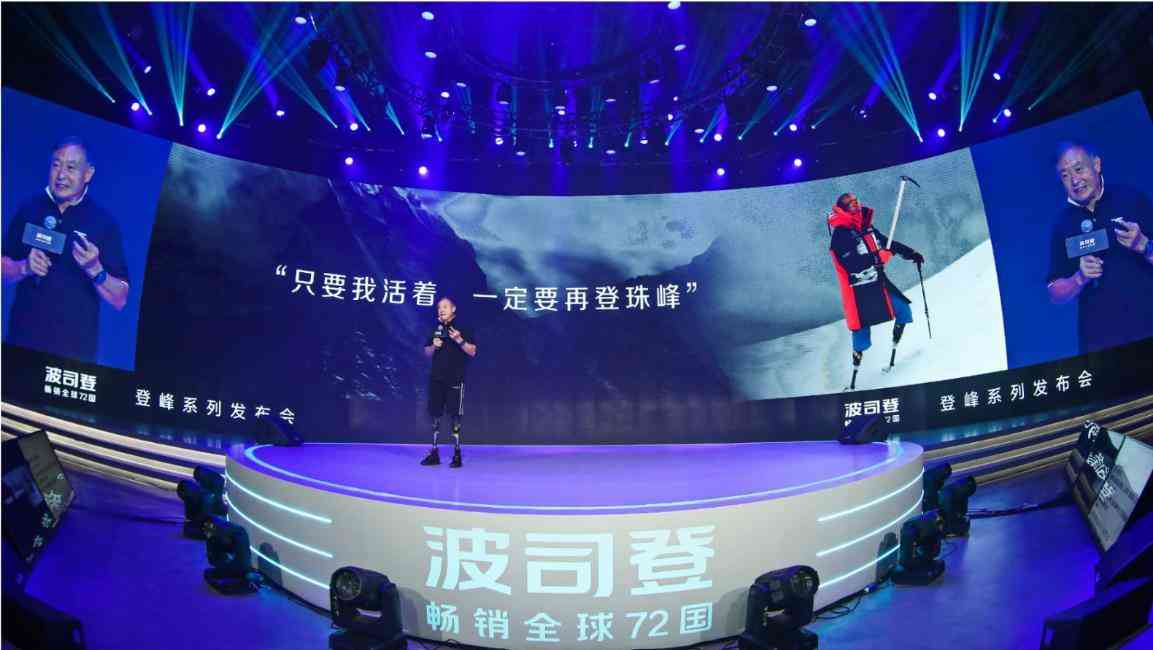 發(fā)布會現(xiàn)場富有科技感。入口處是一道由世界著名高峰的模型與圖片組成的長廊,包括“世界之巔”珠穆朗瑪峰、“歐洲之巔”厄爾普魯士峰等,搭配冰晶模型營造出嚴(yán)寒極地的氛圍。模特身穿登峰系列羽絨服出場的時候,以吊威亞的方式從舞臺上空緩緩降落,隨即又沿著雪山向上攀登,攀爬到“峰頂”之后,又速降到舞臺中央。