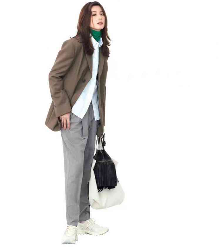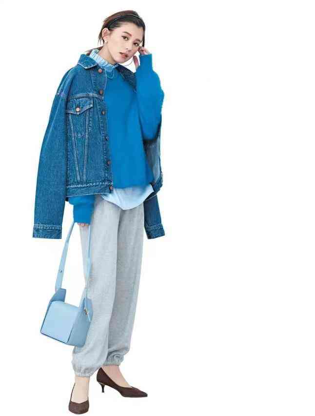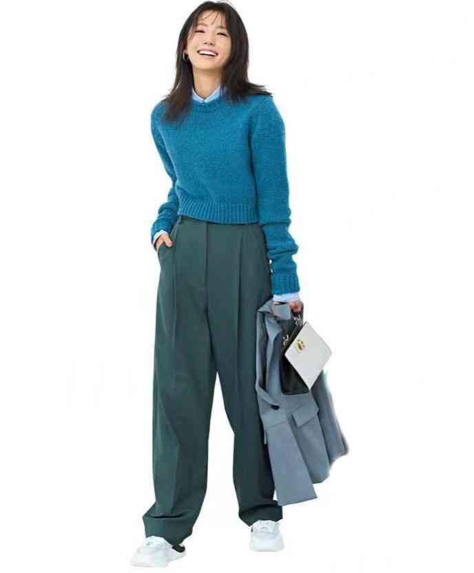 海水藍(lán)色毛衣,內(nèi)搭淺藍(lán)襯衫,下配綠色闊腿褲,延綿起同色浪漫。小白鞋與領(lǐng)口淺藍(lán)呼應(yīng),灰色西服依傍,全憑配色出彩。