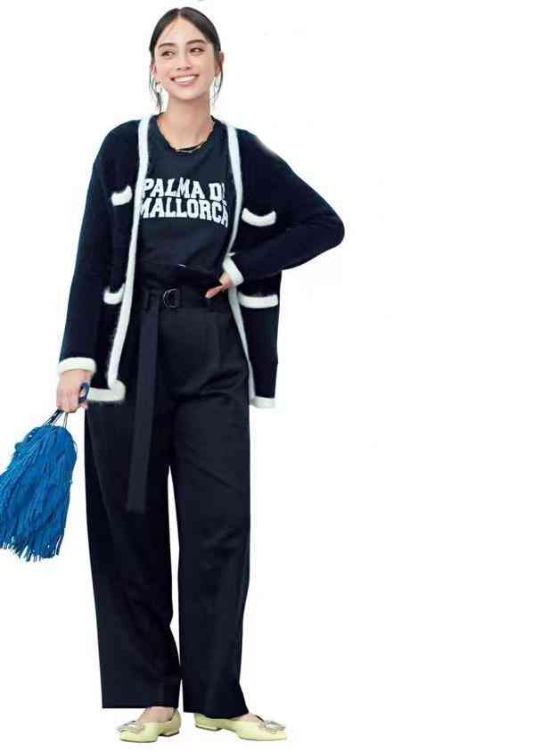 一件黑色為主、白色為輔的開(kāi)衫外套,.思路就是一身黑色搭配。內(nèi)搭換成黑底白字,與外套白邊呼應(yīng),時(shí)尚沖突更鮮明。