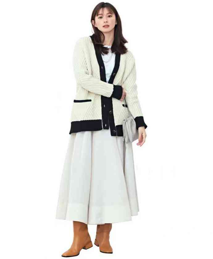 白色為主、黑色為輔的開(kāi)衫,甜美溫柔最為強(qiáng)烈。沿襲這個(gè)思路,搭配白色傘裙,是不是想要的淑女范呢?