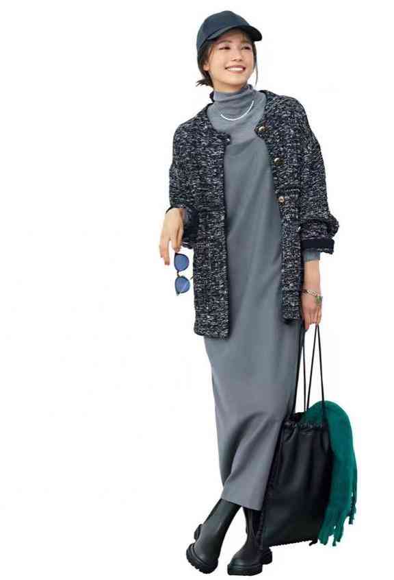 黑灰的花呢外套,中性>端莊。于是,內(nèi)搭直筒吊帶裙,配一雙切爾西短靴,利用大氣灰的美名,為造型增添光彩。