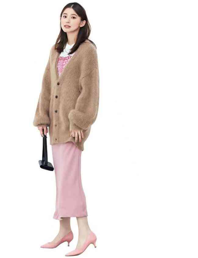 棕色大毛衣,寬厚肥大,下有修身直筒裙和尖頭細(xì)跟鞋撐腰,調(diào)和得當(dāng)。