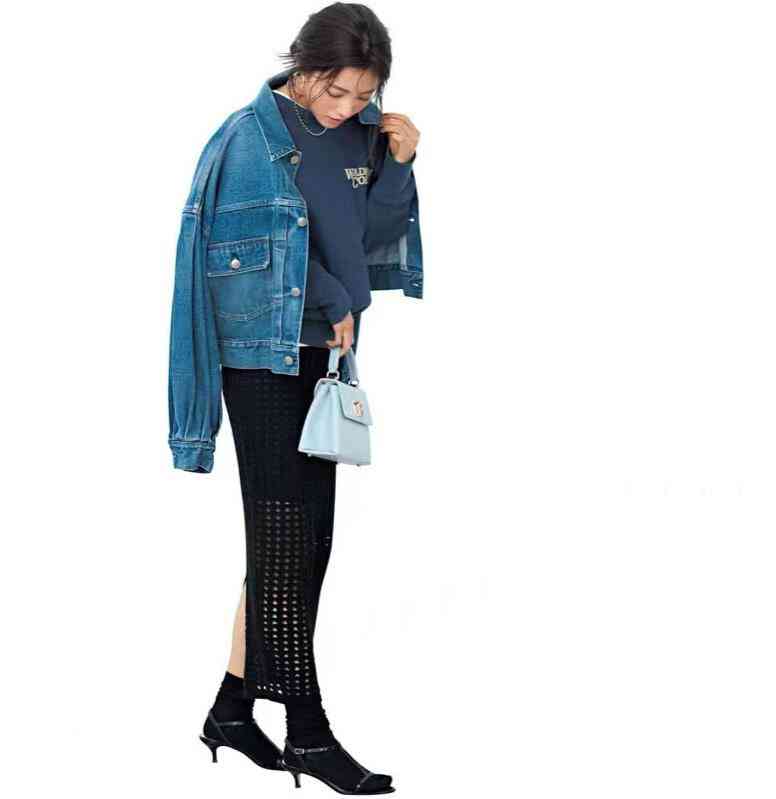 黑色縷空直筒裙,嫵媚且妖嬈。與牛仔外套、休閑衛(wèi)衣的混搭,中和性感,又酷又美。原本是黑色涼鞋,疊穿襪子后直接化身短靴效果。