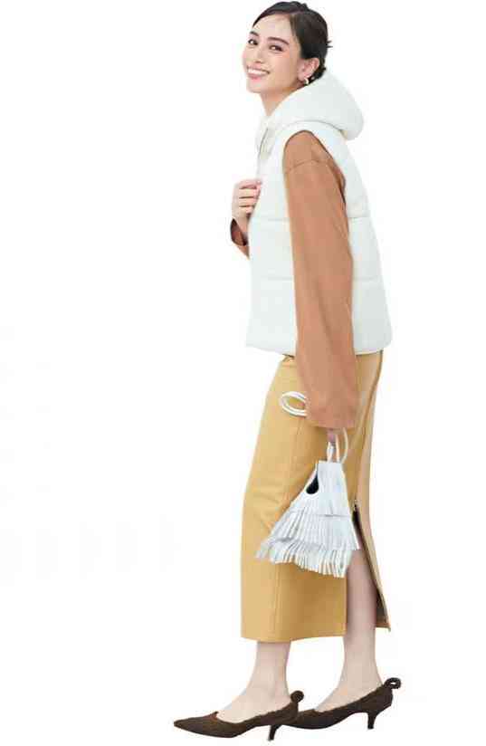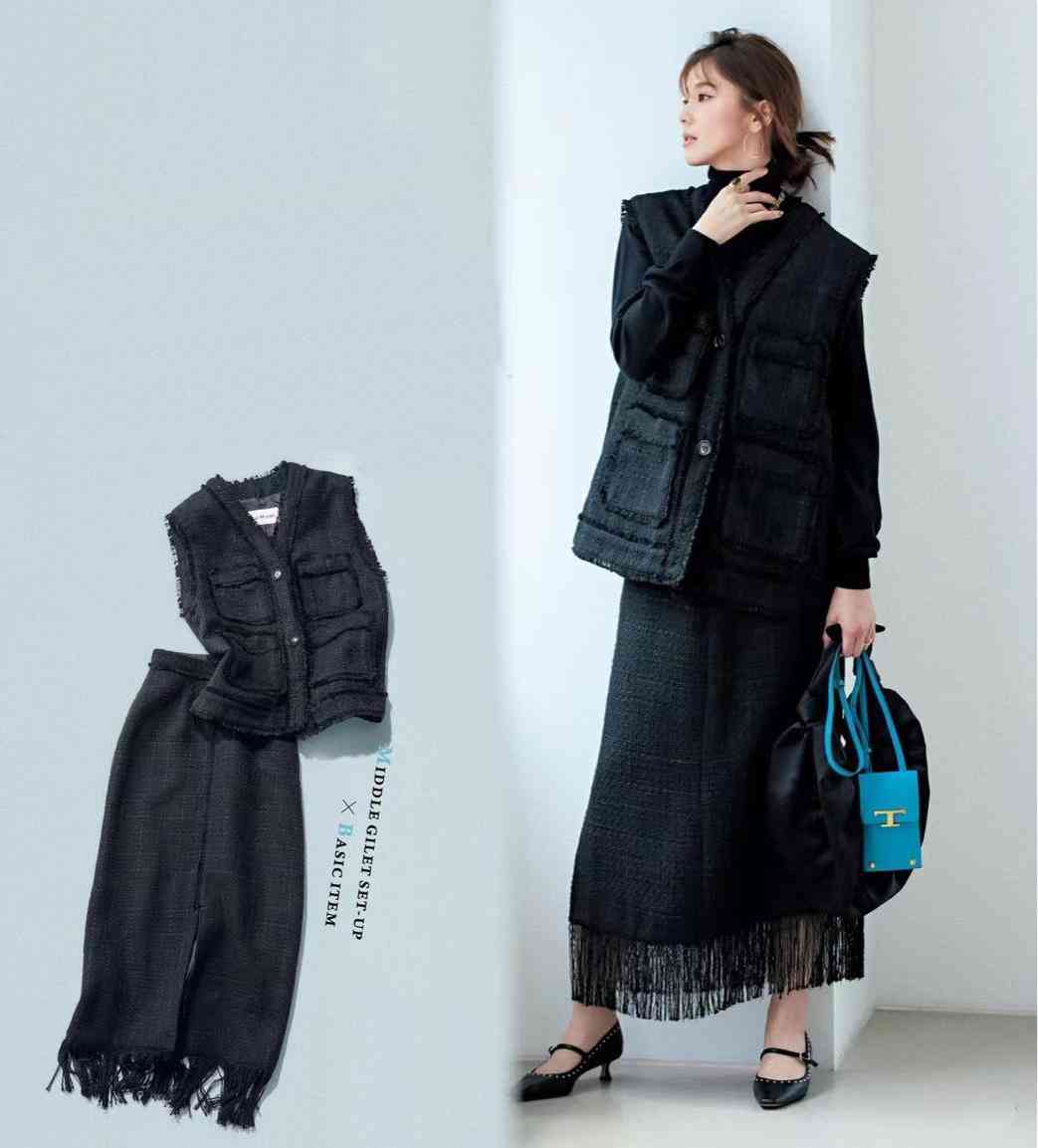 這套搭配,小香風(fēng)馬甲與半裙是套裝,奠定著和諧根基。內(nèi)搭黑色小高領(lǐng),利用材質(zhì)差異制造層次變化,大氣有個(gè)性。