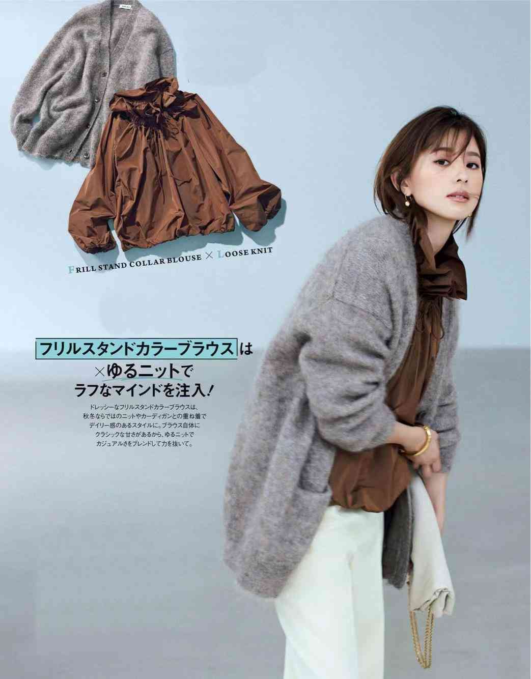 厚厚的毛衣開(kāi)衫,想要顯得輕盈,內(nèi)搭的輕薄襯衫起著功不可沒(méi)的調(diào)和作用。華麗拉夫領(lǐng)的精致與細(xì)膩,挑戰(zhàn)著針織的粗獷,對(duì)比鮮明。