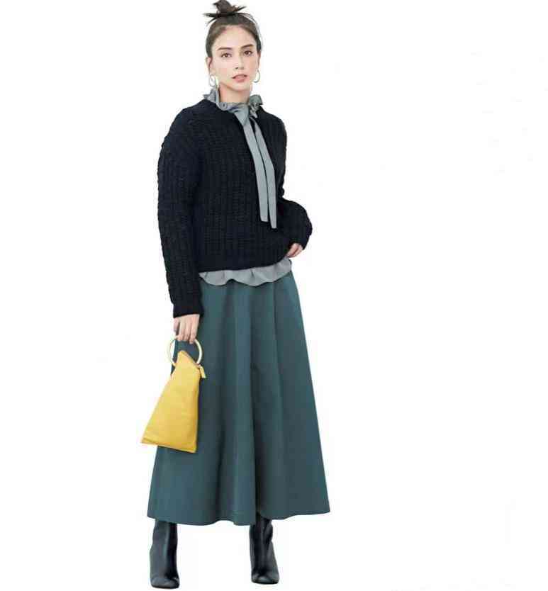 黑色毛衣配傘裙,端莊大氣,還有絲絲浪漫氤氳。為了制造完美的層次細(xì)節(jié),內(nèi)搭灰色系帶襯衫,華麗領(lǐng)口、波浪下擺,提升美感氛圍。